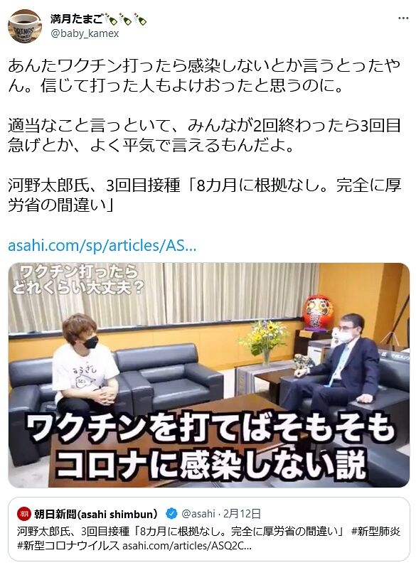 そもそも今出回っているワクチンがオミクロン以降のウイルスにたいしてほぼ効果ない、ということを何故言わない。それに3回打つ意味もなかった。 ずっと「ADE」のことは言われていたのに、なかなか世間にそのことが伝わらなかった。 自分は福祉関係で働いていることの立場上、ワクチンを仕方なく3回打った。そのたびに副作用もでた。また長い時間を経て、どんな副作用がでるかもわからない。国はワクチン接種データ改ざん事件含め、ちゃんとした情報を伝えない上に隠蔽までしている。無駄にワクチンを打つ必要もなかったことをちゃんと伝えるべきだ。