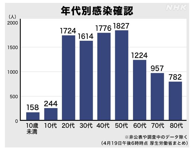 感染者の大半は20代から50代しかし死亡者の殆どは60代以上で80代が過半数。