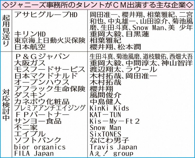 ジャニーズ事務所に所属するタレントのテレビCM起用に関しては「一連の取り組みの内容及び成果に基づいて判断する」とした。