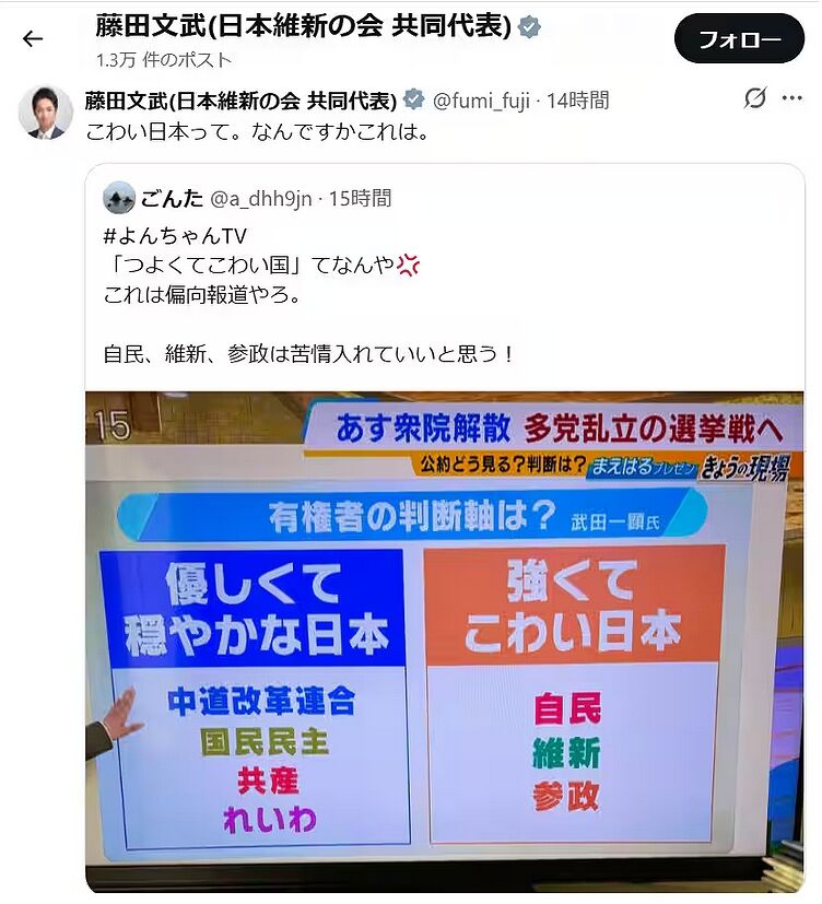 公共の電波を使い、特定の政党(自民党、日本維新の会、参政党)を「強くて怖いと思われる日本」を目指すグループとしてカテゴライズし、一方で立憲民主党や共産党などを「優しくて穏やかな日本」としたこの解説は、明らかに特定の政治的意図を感じさせるものであった。