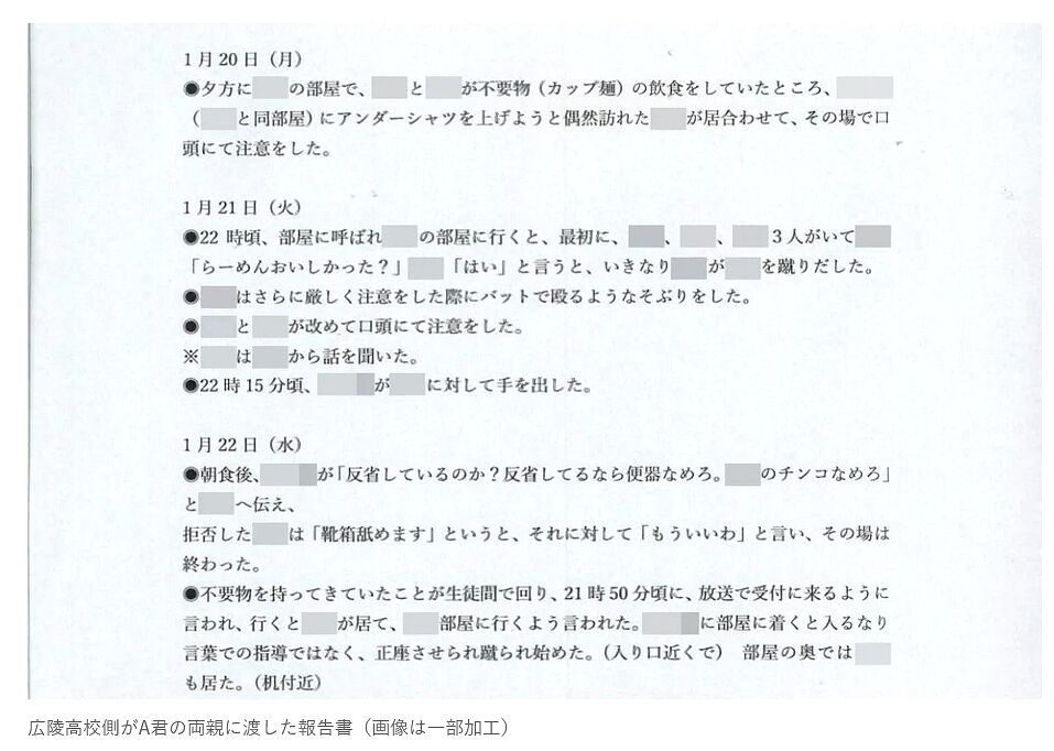 上記の暴行事案の報告書とは別に、両親の側がA君に聞いた話をもとに学校側の対応不備について質問を投げかけ、学校側が回答した報告書がある。そこにはA君が寮に戻った1月26日以降に中井監督と面談した記述がある。コーチ3人も見守る中でのやり取りについて、両親の側は次のように記している。