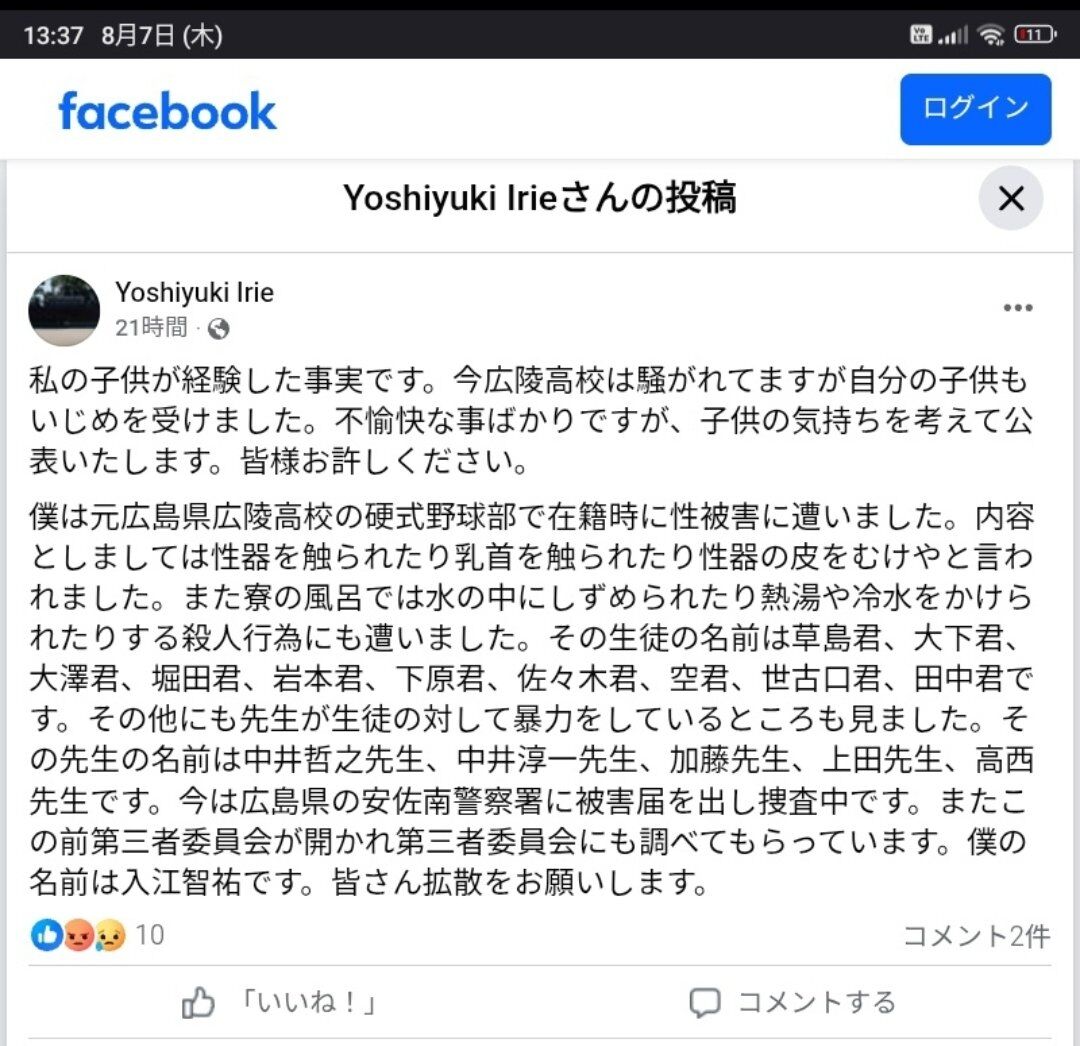 「加害者と隠蔽した大人を罰するべきであって、罪のない選手まで巻き添えにする『連帯責任』という軍隊のような意識も全く賛同できない・・・」と学校側の対応を批判し、「広島出身としても本当に残念なこと」と吐露した。